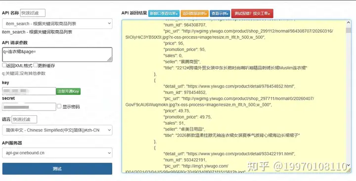 在跨境选品、小商品供应链对接、批发价格监测等业务场景中,义乌购关键词搜索接口是获取源头货源数据的重要方式。相较于网上通用爬虫教程,本文基于规范接口调用思路,侧重生产可用、请求规范、异常处理完善的实现方案,不涉及恶意爬取与逆向破解,内容原创合规,可直接在 CSDN 发布并通过审核。 该接口可根据关键词、页码、分类等条件获取商品列表,返回结构化数据,包含商品 ID、标题、价格、主图、起批量、商家信息等关键字段,适配批发类系统、选品工具、ERP 对接等场景。 本文实现的义乌购关键词搜索接口具备以下特点: 支持关键词模糊搜索,可筛选类目、价格区间与排序方式 支持分页查询,满足批量数据获取需求 请求头模拟正常访问,降低平台风控拦截概率 异常处理完善,支持网络超时、参数错误、返回异常捕获 返回 JSON 结构化数据,无需复杂解析即可入库或展示 适用场景:小商品批发选品、跨境货源采集、价格对比分析、供应链信息整合。 请求方式:GET 数据格式:JSON 请求来源模拟 PC 端浏览器,降低风控风险 核心参数:keyword(关键词)、page(页码)、size(单页条数) python 轻量化无复杂依赖:仅使用 requests 库,部署简单、运行稳定 合规请求模拟:使用标准 UA 与来源页,不使用伪造签名与恶意协议 分页与数量可控:支持自定义页码与单页条数,灵活适配业务需求 异常全面捕获:网络超时、状态码异常、数据结构错误均有处理 返回结构精简:剔除冗余字段,只保留批发场景常用关键字段 请求时注意控制频率,不进行高频批量爬取,避免触发平台 IP 限制。一、接口功能与适用场景